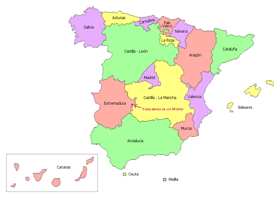 After departing from Finisterre in Galicia, we traveled via Madrid to Extremadura. Fuenlabrada de los Montes, where Yannick stayed until Diana Luz returned from the US, is located in eastern Extremadura. Specifically, it is southwest of Madrid, north of Badajoz, and east of Ciudad Real in Castilla-La Mancha. It is also relatively close to the border with Andalusia.