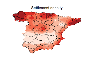 In contrast, Galicia and País Vasco autonomous communities, along with the province of Barcelona, have the highest settlement density. Additionally, the metropolitan area of Madrid in the center of Spain exhibits high settlement density due to its concentrated population.