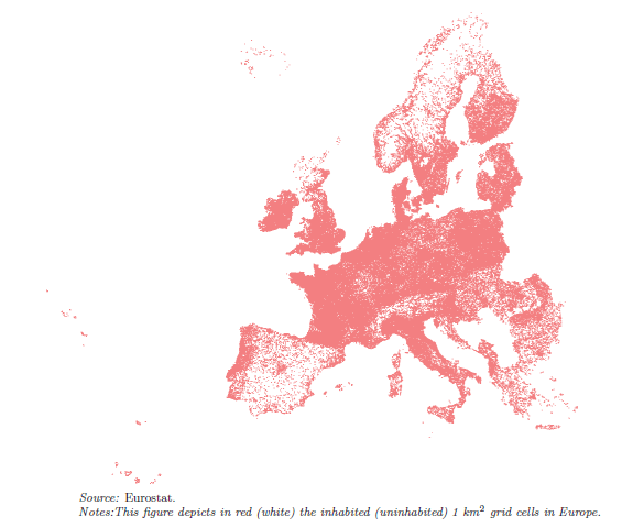 To provide context, we’ll refer to figures from a paper published by Banco de España titled “The Spatial Distribution of Population in Spain: An Anomaly in European Perspective”. The first figure illustrates inhabited areas in red and uninhabited areas in white.